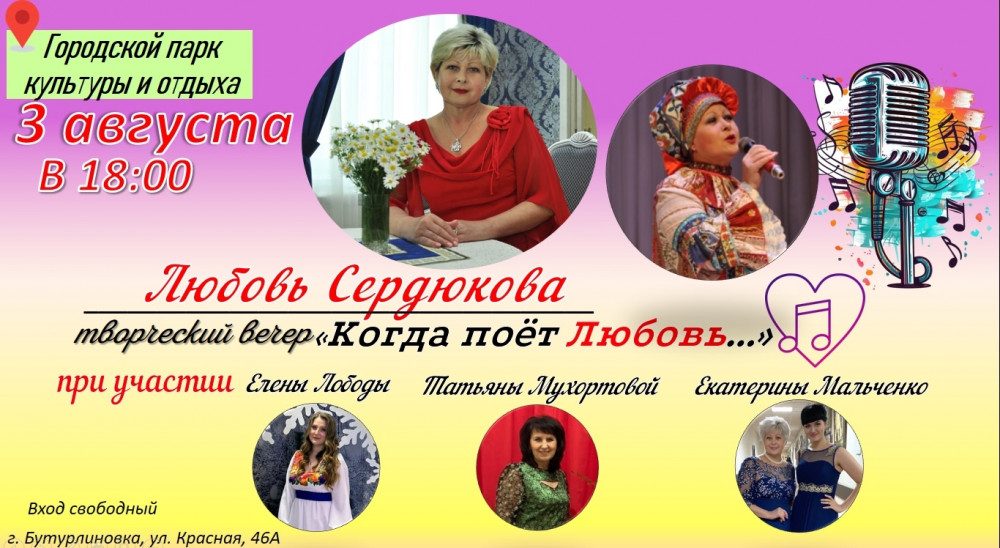Уважаемые бутурлиновцы и гости нашего района! Приглашаем Вас посетить прекрасный творческий вечер Любови Сердюковой «Когда поёт Любовь... » с участием : Елены Лободы, Екатерины Мальченко и Татьяны Мухортовой